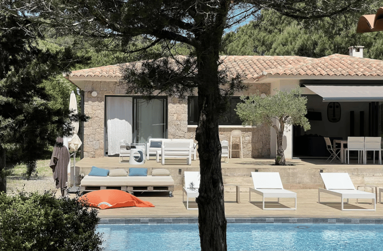 Le vaste espace extérieur, avec sa piscine privée parfaitement intégrée dans l’environnement, invite à la détente entre ciel bleu et senteurs de maquis.